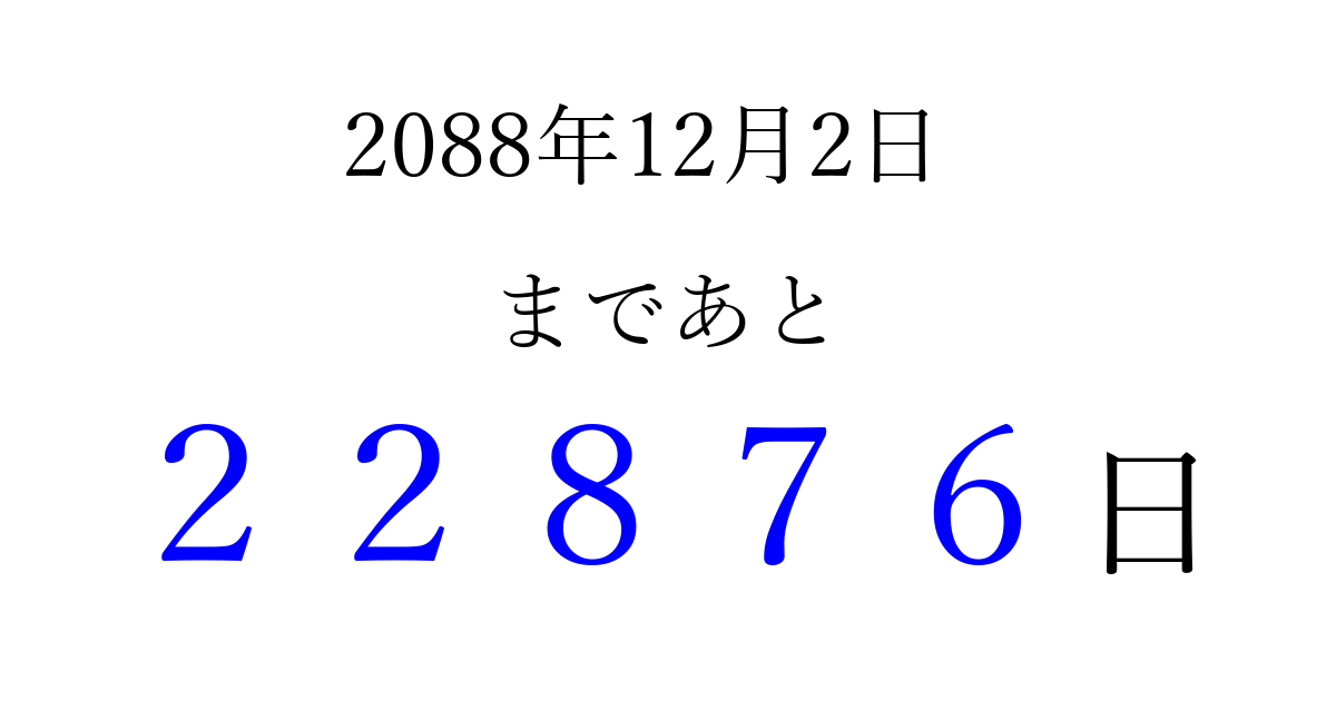2088年12月2日(木)まで あと 99999 日です 追加すると、トップページからすぐ選べるようになります ※2026/04/16現在の結果です。 最新の状態に更新する ↓シェアして、タイムライン上にカウントダウンを表示しよう!↓ 📤 この結果を共有する Tweet シェア Threads Bluesky 別の日付でカウントダウン 2088年12月のカレンダー このページをブックマークに追加すると、いつでもカウントダウンを確認できます。 (PC: Ctrl+D / Mac: ⌘+D) hitome-notes.comでは以下のページも運営しています。 指定日と期間から日付を計算 | ガチャ確率計算・シミュレーション | プライバシー・ポリシー 運営者:Avocado