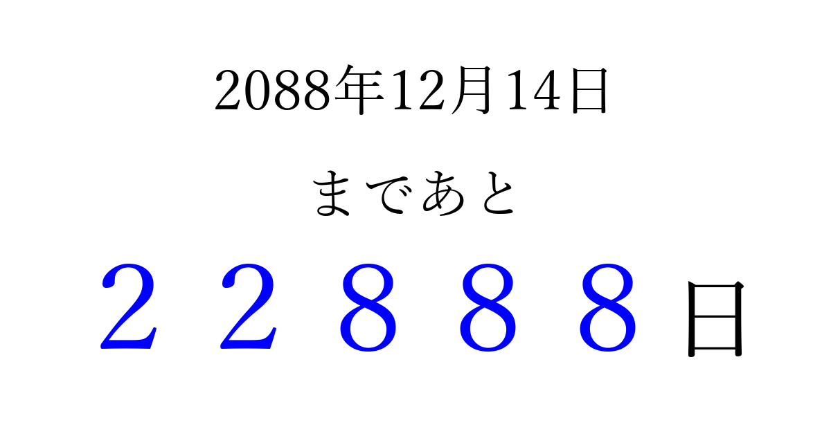 2088年12月14日(火)まで あと 99999 日です 追加すると、トップページからすぐ選べるようになります ※2026/04/16現在の結果です。 最新の状態に更新する ↓シェアして、タイムライン上にカウントダウンを表示しよう!↓ 📤 この結果を共有する Tweet シェア Threads Bluesky 別の日付でカウントダウン 2088年12月のカレンダー このページをブックマークに追加すると、いつでもカウントダウンを確認できます。 (PC: Ctrl+D / Mac: ⌘+D) hitome-notes.comでは以下のページも運営しています。 指定日と期間から日付を計算 | ガチャ確率計算・シミュレーション | プライバシー・ポリシー 運営者:Avocado