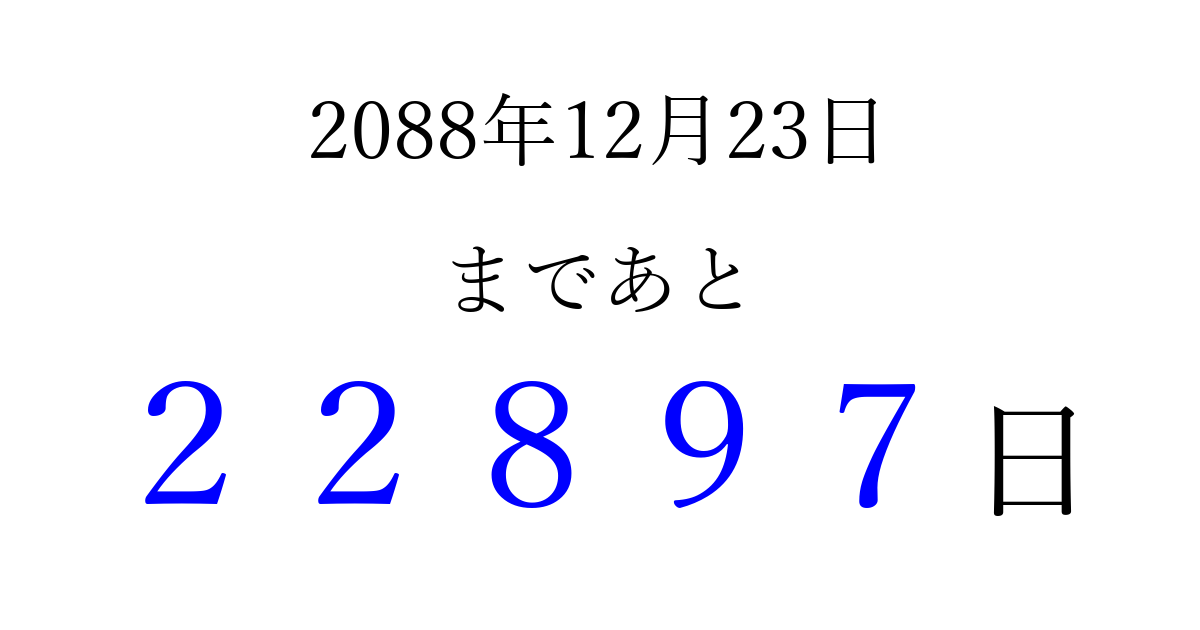 2088年12月23日(木)まで あと 99999 日です 追加すると、トップページからすぐ選べるようになります ※2026/04/16現在の結果です。 最新の状態に更新する ↓シェアして、タイムライン上にカウントダウンを表示しよう!↓ 📤 この結果を共有する Tweet シェア Threads Bluesky 別の日付でカウントダウン 2088年12月のカレンダー このページをブックマークに追加すると、いつでもカウントダウンを確認できます。 (PC: Ctrl+D / Mac: ⌘+D) hitome-notes.comでは以下のページも運営しています。 指定日と期間から日付を計算 | ガチャ確率計算・シミュレーション | プライバシー・ポリシー 運営者:Avocado