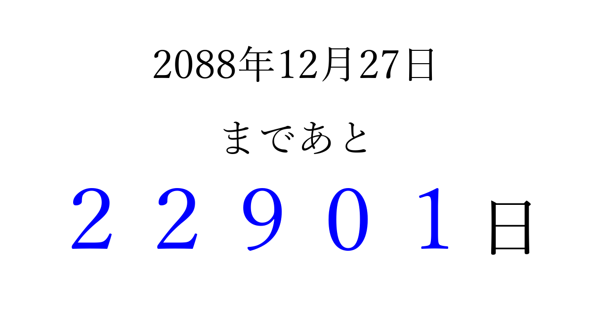 2088年12月27日(月)まで あと 99999 日です 追加すると、トップページからすぐ選べるようになります ※2026/04/16現在の結果です。 最新の状態に更新する ↓シェアして、タイムライン上にカウントダウンを表示しよう!↓ 📤 この結果を共有する Tweet シェア Threads Bluesky 別の日付でカウントダウン 2088年12月のカレンダー このページをブックマークに追加すると、いつでもカウントダウンを確認できます。 (PC: Ctrl+D / Mac: ⌘+D) hitome-notes.comでは以下のページも運営しています。 指定日と期間から日付を計算 | ガチャ確率計算・シミュレーション | プライバシー・ポリシー 運営者:Avocado