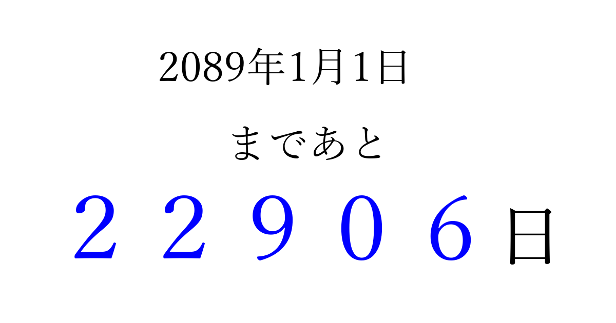 2089年1月1日(土)まで あと 99999 日です 追加すると、トップページからすぐ選べるようになります ※2026/04/16現在の結果です。 最新の状態に更新する ↓シェアして、タイムライン上にカウントダウンを表示しよう!↓ 📤 この結果を共有する Tweet シェア Threads Bluesky 別の日付でカウントダウン 2089年1月のカレンダー このページをブックマークに追加すると、いつでもカウントダウンを確認できます。 (PC: Ctrl+D / Mac: ⌘+D) hitome-notes.comでは以下のページも運営しています。 指定日と期間から日付を計算 | ガチャ確率計算・シミュレーション | プライバシー・ポリシー 運営者:Avocado