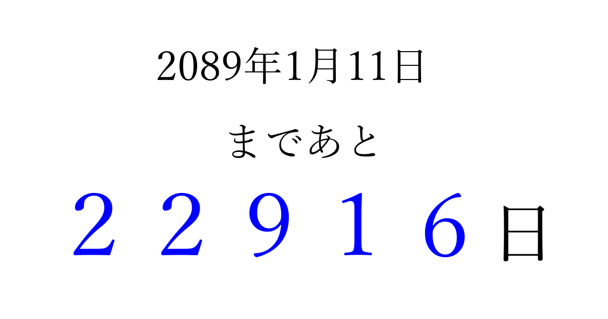 2089年1月11日(火)まで あと 99999 日です 追加すると、トップページからすぐ選べるようになります ※2026/04/16現在の結果です。 最新の状態に更新する ↓シェアして、タイムライン上にカウントダウンを表示しよう!↓ 📤 この結果を共有する Tweet シェア Threads Bluesky 別の日付でカウントダウン 2089年1月のカレンダー このページをブックマークに追加すると、いつでもカウントダウンを確認できます。 (PC: Ctrl+D / Mac: ⌘+D) hitome-notes.comでは以下のページも運営しています。 指定日と期間から日付を計算 | ガチャ確率計算・シミュレーション | プライバシー・ポリシー 運営者:Avocado