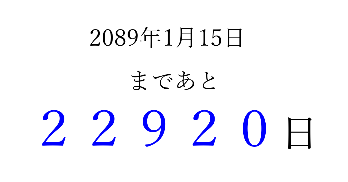 2089年1月15日(土)まで あと 99999 日です 追加すると、トップページからすぐ選べるようになります ※2026/04/16現在の結果です。 最新の状態に更新する ↓シェアして、タイムライン上にカウントダウンを表示しよう!↓ 📤 この結果を共有する Tweet シェア Threads Bluesky 別の日付でカウントダウン 2089年1月のカレンダー このページをブックマークに追加すると、いつでもカウントダウンを確認できます。 (PC: Ctrl+D / Mac: ⌘+D) hitome-notes.comでは以下のページも運営しています。 指定日と期間から日付を計算 | ガチャ確率計算・シミュレーション | プライバシー・ポリシー 運営者:Avocado
