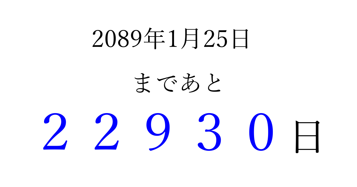 2089年1月25日(火)まで あと 99999 日です 追加すると、トップページからすぐ選べるようになります ※2026/04/16現在の結果です。 最新の状態に更新する ↓シェアして、タイムライン上にカウントダウンを表示しよう!↓ 📤 この結果を共有する Tweet シェア Threads Bluesky 別の日付でカウントダウン 2089年1月のカレンダー このページをブックマークに追加すると、いつでもカウントダウンを確認できます。 (PC: Ctrl+D / Mac: ⌘+D) hitome-notes.comでは以下のページも運営しています。 指定日と期間から日付を計算 | ガチャ確率計算・シミュレーション | プライバシー・ポリシー 運営者:Avocado