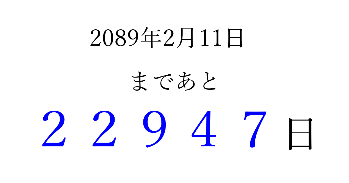 2089年2月11日(金)まで あと 99999 日です 追加すると、トップページからすぐ選べるようになります ※2026/04/16現在の結果です。 最新の状態に更新する ↓シェアして、タイムライン上にカウントダウンを表示しよう!↓ 📤 この結果を共有する Tweet シェア Threads Bluesky 別の日付でカウントダウン 2089年2月のカレンダー このページをブックマークに追加すると、いつでもカウントダウンを確認できます。 (PC: Ctrl+D / Mac: ⌘+D) hitome-notes.comでは以下のページも運営しています。 指定日と期間から日付を計算 | ガチャ確率計算・シミュレーション | プライバシー・ポリシー 運営者:Avocado