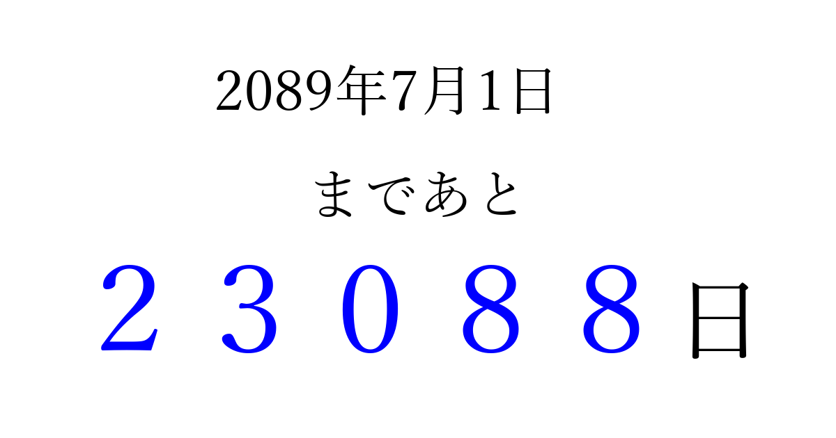 2089年7月1日(金)まで あと 99999 日です 追加すると、トップページからすぐ選べるようになります ※2026/04/15現在の結果です。 最新の状態に更新する ↓シェアして、タイムライン上にカウントダウンを表示しよう!↓ 📤 この結果を共有する Tweet シェア Threads Bluesky 別の日付でカウントダウン 2089年7月のカレンダー このページをブックマークに追加すると、いつでもカウントダウンを確認できます。 (PC: Ctrl+D / Mac: ⌘+D) hitome-notes.comでは以下のページも運営しています。 指定日と期間から日付を計算 | ガチャ確率計算・シミュレーション | プライバシー・ポリシー 運営者:Avocado