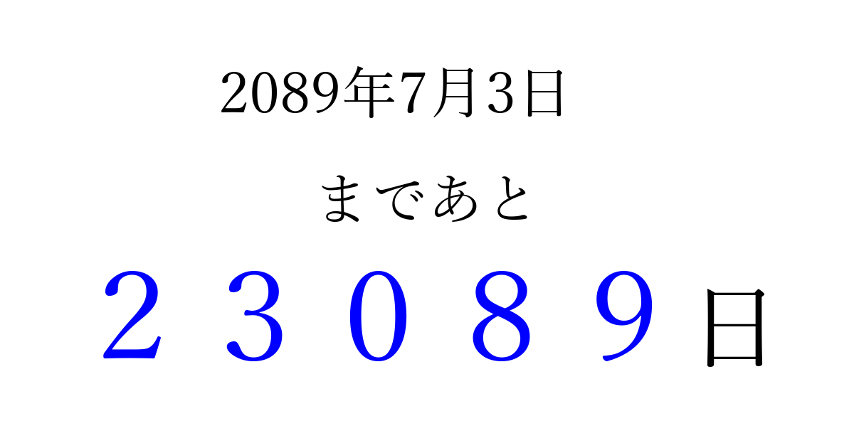 2089年7月3日(日)まで あと 99999 日です 追加すると、トップページからすぐ選べるようになります ※2026/04/16現在の結果です。 最新の状態に更新する ↓シェアして、タイムライン上にカウントダウンを表示しよう!↓ 📤 この結果を共有する Tweet シェア Threads Bluesky 別の日付でカウントダウン 2089年7月のカレンダー このページをブックマークに追加すると、いつでもカウントダウンを確認できます。 (PC: Ctrl+D / Mac: ⌘+D) hitome-notes.comでは以下のページも運営しています。 指定日と期間から日付を計算 | ガチャ確率計算・シミュレーション | プライバシー・ポリシー 運営者:Avocado