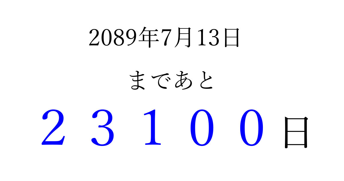 2089年7月13日(水)まで あと 99999 日です 追加すると、トップページからすぐ選べるようになります ※2026/04/15現在の結果です。 最新の状態に更新する ↓シェアして、タイムライン上にカウントダウンを表示しよう!↓ 📤 この結果を共有する Tweet シェア Threads Bluesky 別の日付でカウントダウン 2089年7月のカレンダー このページをブックマークに追加すると、いつでもカウントダウンを確認できます。 (PC: Ctrl+D / Mac: ⌘+D) hitome-notes.comでは以下のページも運営しています。 指定日と期間から日付を計算 | ガチャ確率計算・シミュレーション | プライバシー・ポリシー 運営者:Avocado