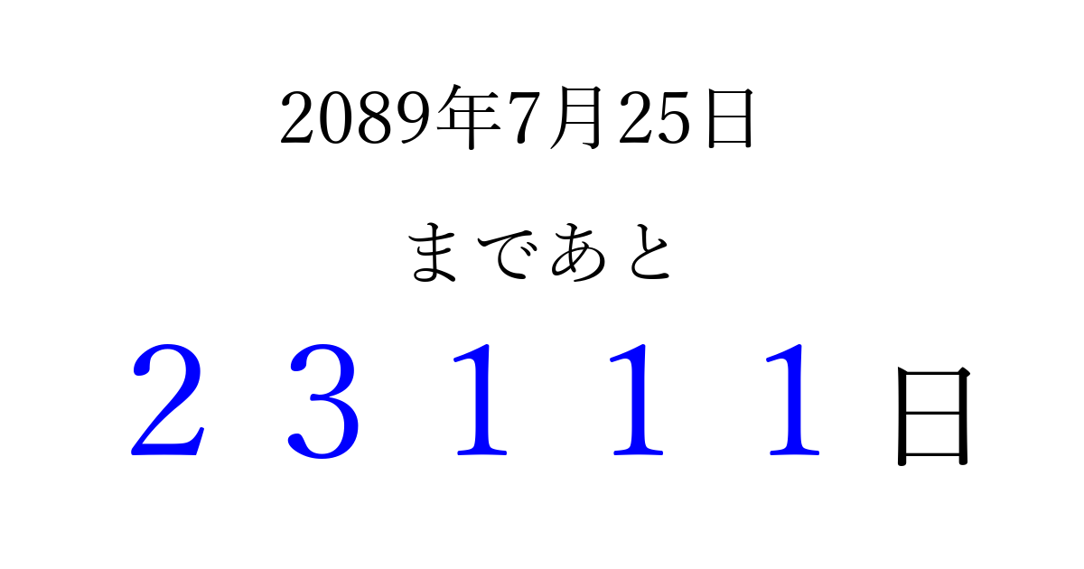 2089年7月25日(月)まで あと 99999 日です 追加すると、トップページからすぐ選べるようになります ※2026/04/16現在の結果です。 最新の状態に更新する ↓シェアして、タイムライン上にカウントダウンを表示しよう!↓ 📤 この結果を共有する Tweet シェア Threads Bluesky 別の日付でカウントダウン 2089年7月のカレンダー このページをブックマークに追加すると、いつでもカウントダウンを確認できます。 (PC: Ctrl+D / Mac: ⌘+D) hitome-notes.comでは以下のページも運営しています。 指定日と期間から日付を計算 | ガチャ確率計算・シミュレーション | プライバシー・ポリシー 運営者:Avocado