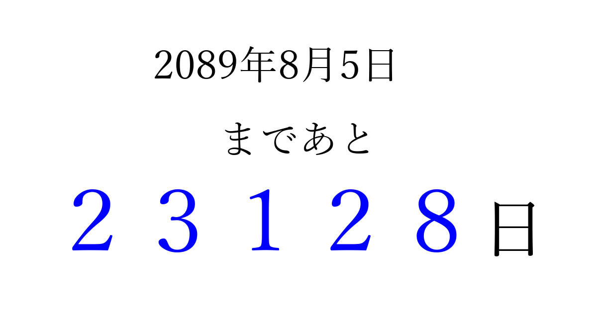 2089年8月5日(金)まで あと 99999 日です 追加すると、トップページからすぐ選べるようになります ※2026/04/10現在の結果です。 最新の状態に更新する ↓シェアして、タイムライン上にカウントダウンを表示しよう!↓ 📤 この結果を共有する Tweet シェア Threads Bluesky 別の日付でカウントダウン 2089年8月のカレンダー このページをブックマークに追加すると、いつでもカウントダウンを確認できます。 (PC: Ctrl+D / Mac: ⌘+D) hitome-notes.comでは以下のページも運営しています。 指定日と期間から日付を計算 | ガチャ確率計算・シミュレーション | プライバシー・ポリシー 運営者:Avocado