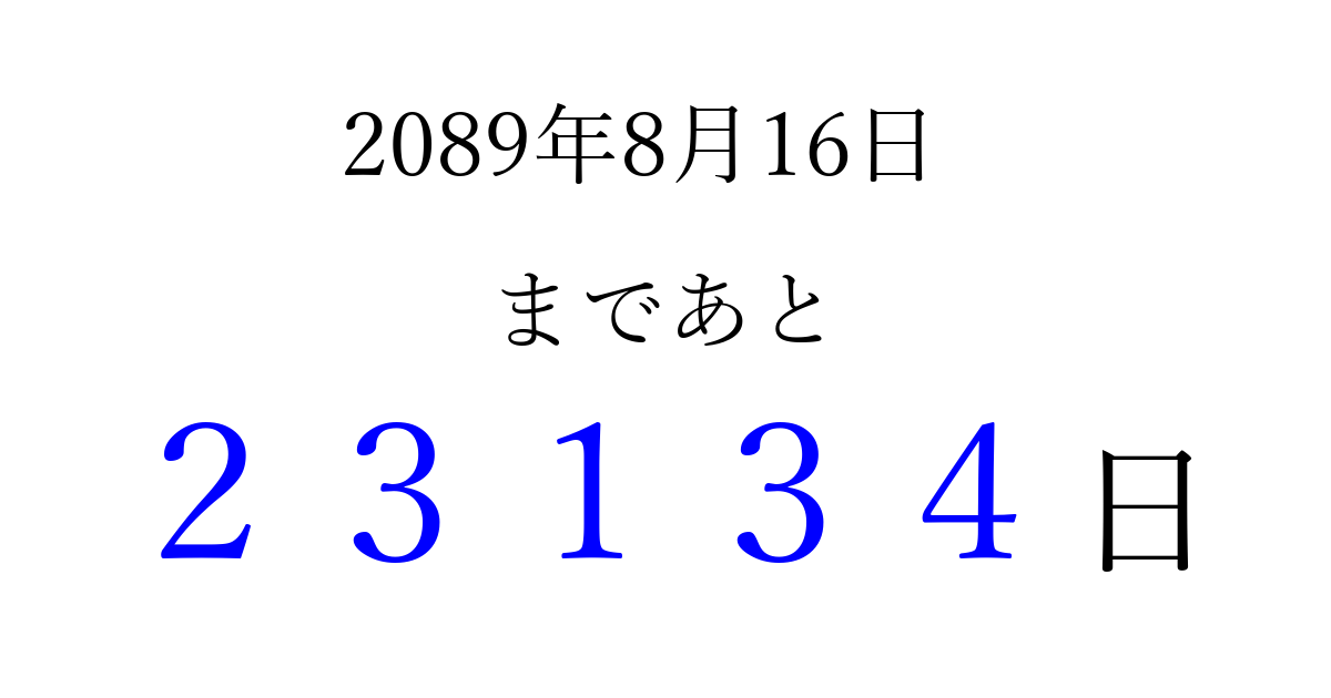 2089年8月16日(火)まで あと 99999 日です 追加すると、トップページからすぐ選べるようになります ※2026/04/15現在の結果です。 最新の状態に更新する ↓シェアして、タイムライン上にカウントダウンを表示しよう!↓ 📤 この結果を共有する Tweet シェア Threads Bluesky 別の日付でカウントダウン 2089年8月のカレンダー このページをブックマークに追加すると、いつでもカウントダウンを確認できます。 (PC: Ctrl+D / Mac: ⌘+D) hitome-notes.comでは以下のページも運営しています。 指定日と期間から日付を計算 | ガチャ確率計算・シミュレーション | プライバシー・ポリシー 運営者:Avocado
