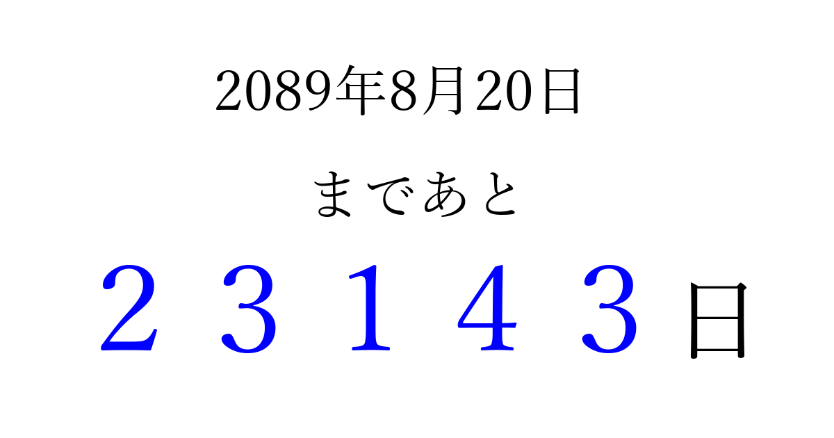2089年8月20日(土)まで あと 99999 日です 追加すると、トップページからすぐ選べるようになります ※2026/04/10現在の結果です。 最新の状態に更新する ↓シェアして、タイムライン上にカウントダウンを表示しよう!↓ 📤 この結果を共有する Tweet シェア Threads Bluesky 別の日付でカウントダウン 2089年8月のカレンダー このページをブックマークに追加すると、いつでもカウントダウンを確認できます。 (PC: Ctrl+D / Mac: ⌘+D) hitome-notes.comでは以下のページも運営しています。 指定日と期間から日付を計算 | ガチャ確率計算・シミュレーション | プライバシー・ポリシー 運営者:Avocado