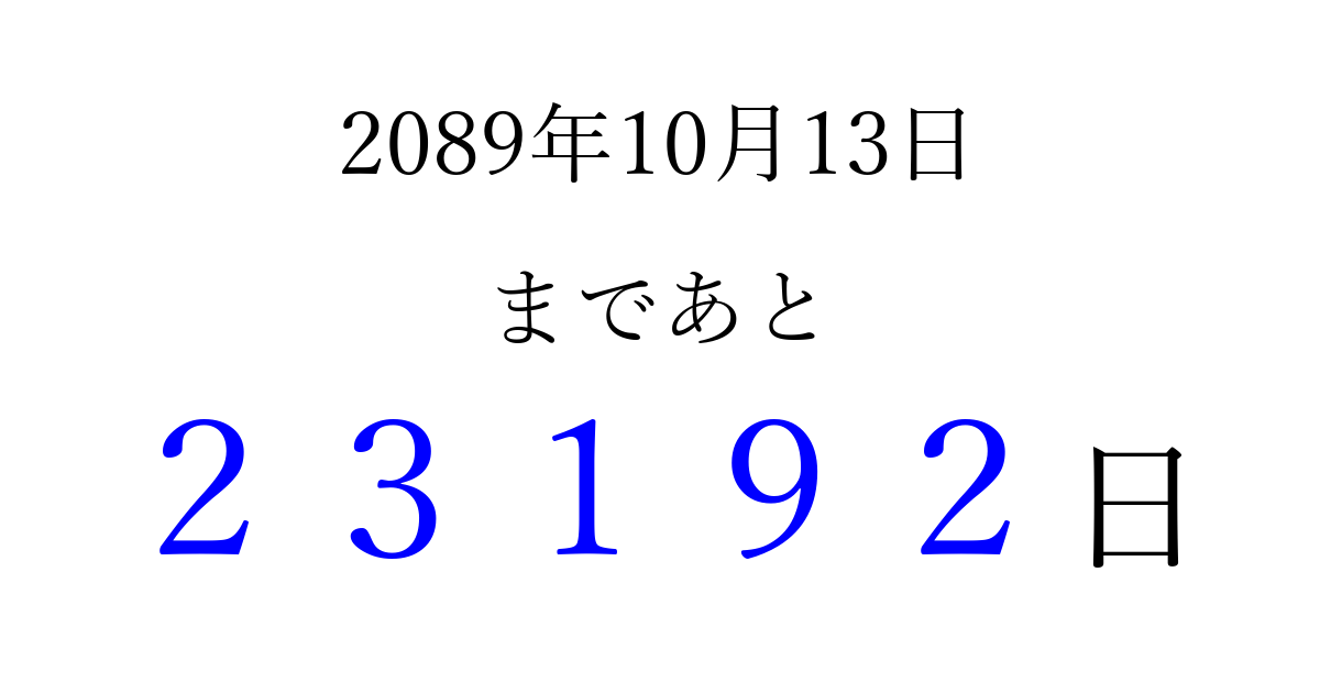 2089年10月13日(木)まで あと 99999 日です 追加すると、トップページからすぐ選べるようになります ※2026/04/15現在の結果です。 最新の状態に更新する ↓シェアして、タイムライン上にカウントダウンを表示しよう!↓ 📤 この結果を共有する Tweet シェア Threads Bluesky 別の日付でカウントダウン 2089年10月のカレンダー このページをブックマークに追加すると、いつでもカウントダウンを確認できます。 (PC: Ctrl+D / Mac: ⌘+D) hitome-notes.comでは以下のページも運営しています。 指定日と期間から日付を計算 | ガチャ確率計算・シミュレーション | プライバシー・ポリシー 運営者:Avocado