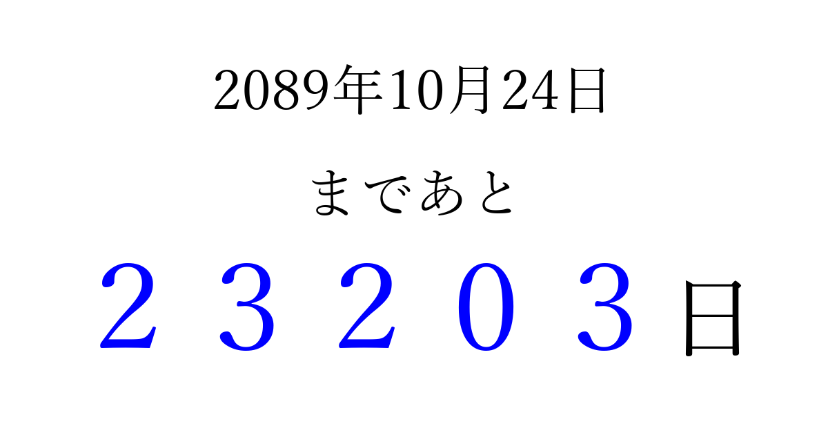 2089年10月24日(月)まで あと 99999 日です 追加すると、トップページからすぐ選べるようになります ※2026/04/15現在の結果です。 最新の状態に更新する ↓シェアして、タイムライン上にカウントダウンを表示しよう!↓ 📤 この結果を共有する Tweet シェア Threads Bluesky 別の日付でカウントダウン 2089年10月のカレンダー このページをブックマークに追加すると、いつでもカウントダウンを確認できます。 (PC: Ctrl+D / Mac: ⌘+D) hitome-notes.comでは以下のページも運営しています。 指定日と期間から日付を計算 | ガチャ確率計算・シミュレーション | プライバシー・ポリシー 運営者:Avocado