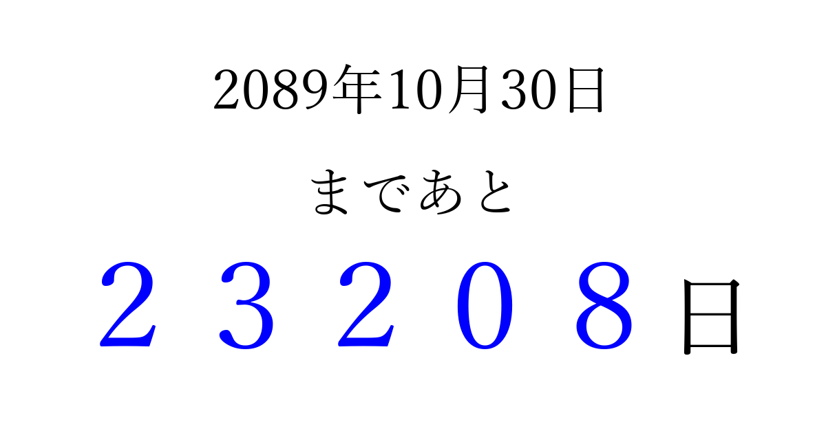 2089年10月30日(日)まで あと 99999 日です 追加すると、トップページからすぐ選べるようになります ※2026/04/16現在の結果です。 最新の状態に更新する ↓シェアして、タイムライン上にカウントダウンを表示しよう!↓ 📤 この結果を共有する Tweet シェア Threads Bluesky 別の日付でカウントダウン 2089年10月のカレンダー このページをブックマークに追加すると、いつでもカウントダウンを確認できます。 (PC: Ctrl+D / Mac: ⌘+D) hitome-notes.comでは以下のページも運営しています。 指定日と期間から日付を計算 | ガチャ確率計算・シミュレーション | プライバシー・ポリシー 運営者:Avocado