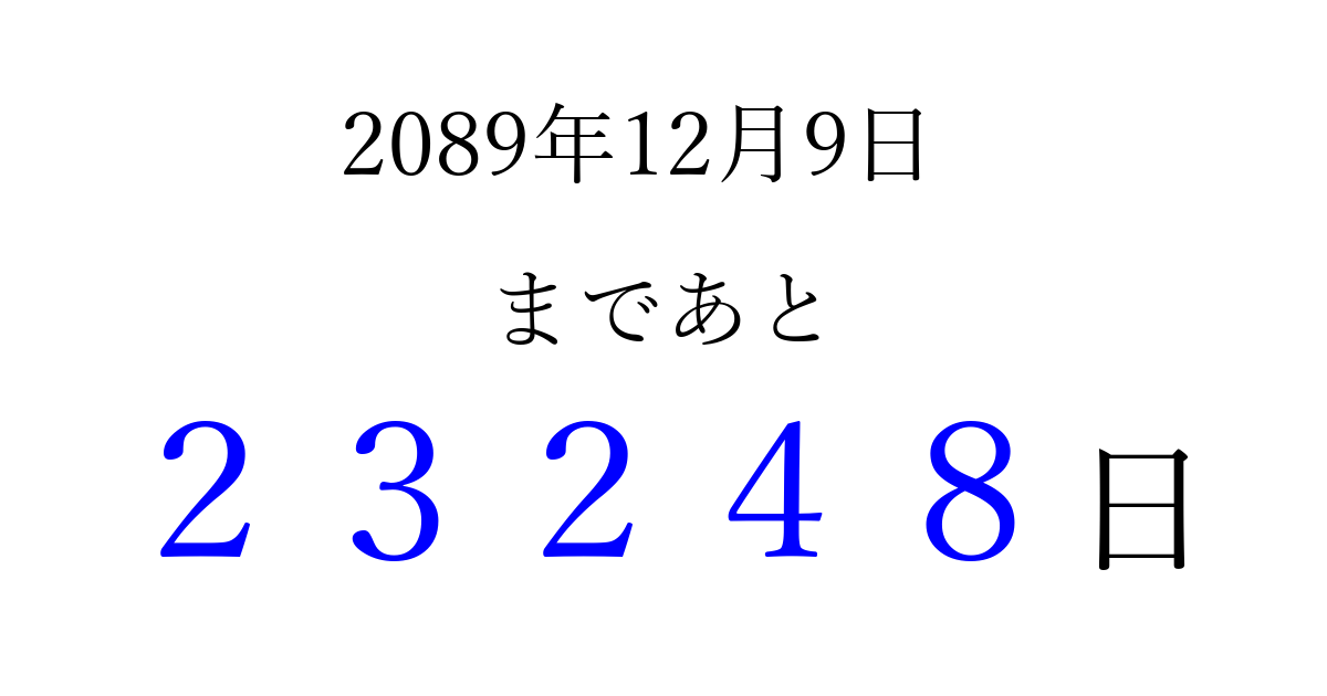 2089年12月9日(金)まで あと 99999 日です 追加すると、トップページからすぐ選べるようになります ※2026/04/16現在の結果です。 最新の状態に更新する ↓シェアして、タイムライン上にカウントダウンを表示しよう!↓ 📤 この結果を共有する Tweet シェア Threads Bluesky 別の日付でカウントダウン 2089年12月のカレンダー このページをブックマークに追加すると、いつでもカウントダウンを確認できます。 (PC: Ctrl+D / Mac: ⌘+D) hitome-notes.comでは以下のページも運営しています。 指定日と期間から日付を計算 | ガチャ確率計算・シミュレーション | プライバシー・ポリシー 運営者:Avocado