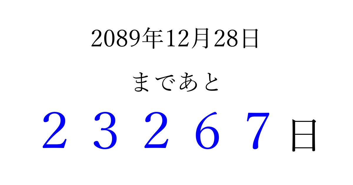 2089年12月28日(水)まで あと 99999 日です 追加すると、トップページからすぐ選べるようになります ※2026/04/16現在の結果です。 最新の状態に更新する ↓シェアして、タイムライン上にカウントダウンを表示しよう!↓ 📤 この結果を共有する Tweet シェア Threads Bluesky 別の日付でカウントダウン 2089年12月のカレンダー このページをブックマークに追加すると、いつでもカウントダウンを確認できます。 (PC: Ctrl+D / Mac: ⌘+D) hitome-notes.comでは以下のページも運営しています。 指定日と期間から日付を計算 | ガチャ確率計算・シミュレーション | プライバシー・ポリシー 運営者:Avocado