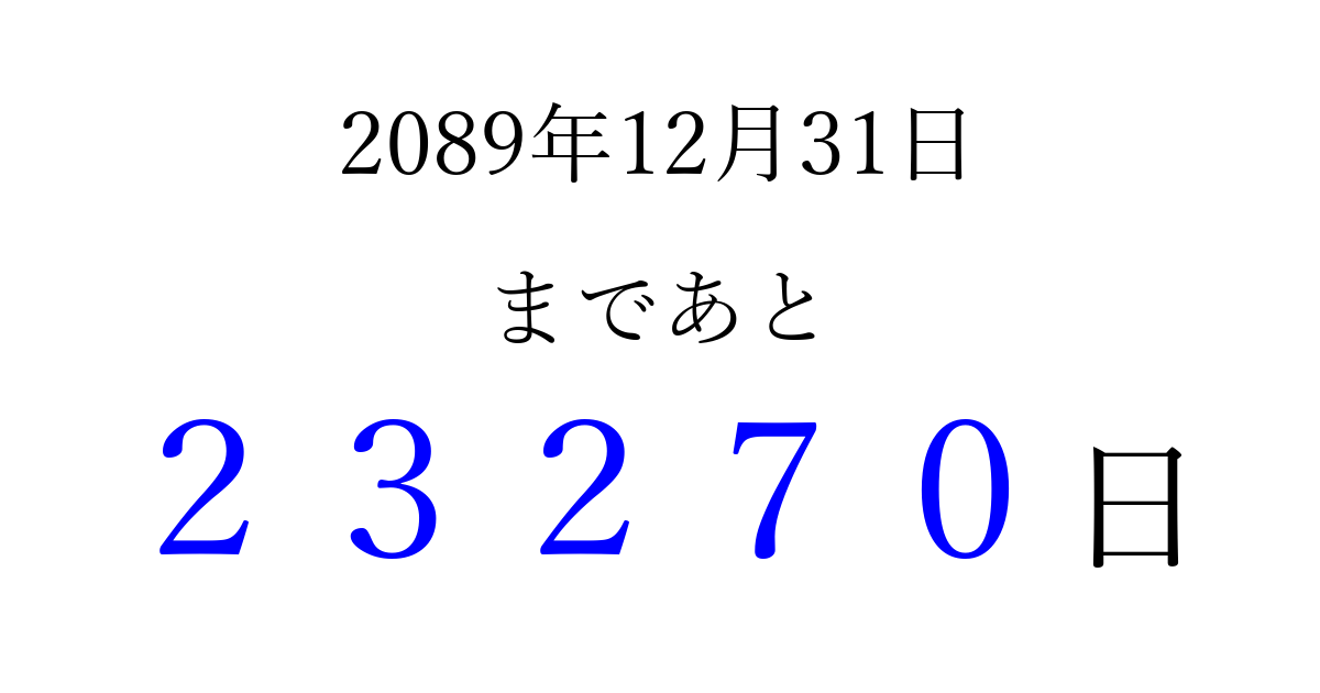 2089年12月31日(土)まで あと 99999 日です 追加すると、トップページからすぐ選べるようになります ※2026/04/16現在の結果です。 最新の状態に更新する ↓シェアして、タイムライン上にカウントダウンを表示しよう!↓ 📤 この結果を共有する Tweet シェア Threads Bluesky 別の日付でカウントダウン 2089年12月のカレンダー このページをブックマークに追加すると、いつでもカウントダウンを確認できます。 (PC: Ctrl+D / Mac: ⌘+D) hitome-notes.comでは以下のページも運営しています。 指定日と期間から日付を計算 | ガチャ確率計算・シミュレーション | プライバシー・ポリシー 運営者:Avocado