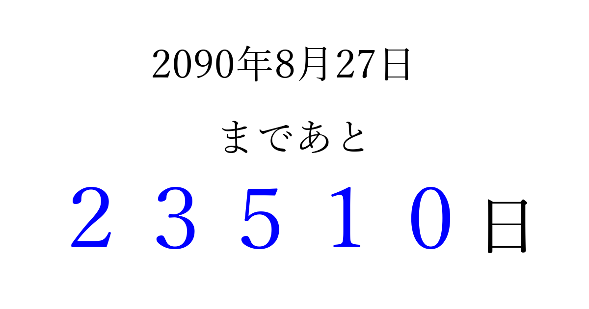 2090年8月27日(日)まで あと 99999 日です 追加すると、トップページからすぐ選べるようになります ※2026/04/15現在の結果です。 最新の状態に更新する ↓シェアして、タイムライン上にカウントダウンを表示しよう!↓ 📤 この結果を共有する Tweet シェア Threads Bluesky 別の日付でカウントダウン 2090年8月のカレンダー このページをブックマークに追加すると、いつでもカウントダウンを確認できます。 (PC: Ctrl+D / Mac: ⌘+D) hitome-notes.comでは以下のページも運営しています。 指定日と期間から日付を計算 | ガチャ確率計算・シミュレーション | プライバシー・ポリシー 運営者:Avocado