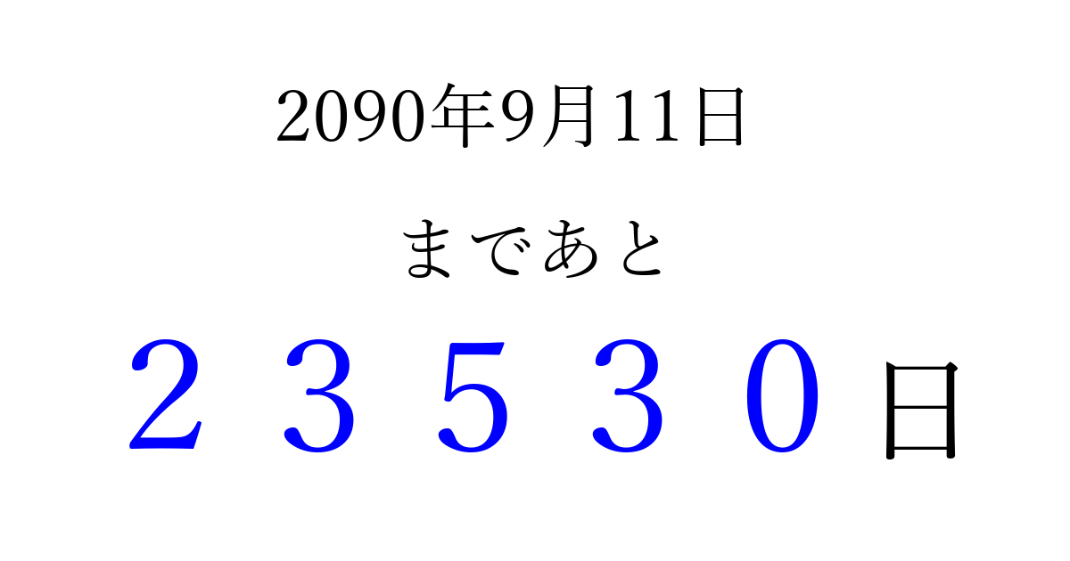2090年9月11日(月)まで あと 99999 日です 追加すると、トップページからすぐ選べるようになります ※2026/04/10現在の結果です。 最新の状態に更新する ↓シェアして、タイムライン上にカウントダウンを表示しよう!↓ 📤 この結果を共有する Tweet シェア Threads Bluesky 別の日付でカウントダウン 2090年9月のカレンダー このページをブックマークに追加すると、いつでもカウントダウンを確認できます。 (PC: Ctrl+D / Mac: ⌘+D) hitome-notes.comでは以下のページも運営しています。 指定日と期間から日付を計算 | ガチャ確率計算・シミュレーション | プライバシー・ポリシー 運営者:Avocado