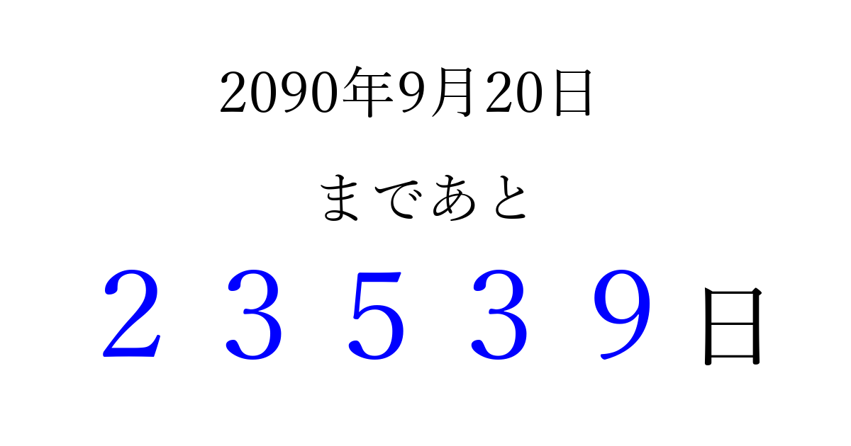 2090年9月20日(水)まで あと 99999 日です 追加すると、トップページからすぐ選べるようになります ※2026/04/10現在の結果です。 最新の状態に更新する ↓シェアして、タイムライン上にカウントダウンを表示しよう!↓ 📤 この結果を共有する Tweet シェア Threads Bluesky 別の日付でカウントダウン 2090年9月のカレンダー このページをブックマークに追加すると、いつでもカウントダウンを確認できます。 (PC: Ctrl+D / Mac: ⌘+D) hitome-notes.comでは以下のページも運営しています。 指定日と期間から日付を計算 | ガチャ確率計算・シミュレーション | プライバシー・ポリシー 運営者:Avocado