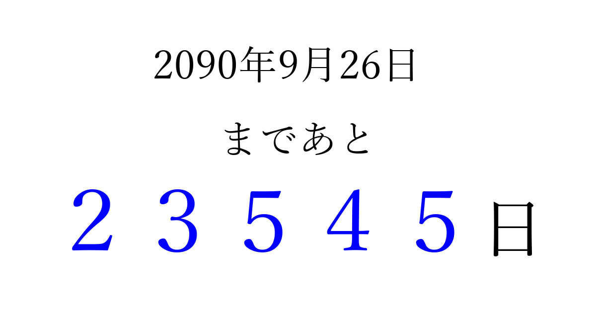 2090年9月26日(火)まで あと 99999 日です 追加すると、トップページからすぐ選べるようになります ※2026/04/10現在の結果です。 最新の状態に更新する ↓シェアして、タイムライン上にカウントダウンを表示しよう!↓ 📤 この結果を共有する Tweet シェア Threads Bluesky 別の日付でカウントダウン 2090年9月のカレンダー このページをブックマークに追加すると、いつでもカウントダウンを確認できます。 (PC: Ctrl+D / Mac: ⌘+D) hitome-notes.comでは以下のページも運営しています。 指定日と期間から日付を計算 | ガチャ確率計算・シミュレーション | プライバシー・ポリシー 運営者:Avocado