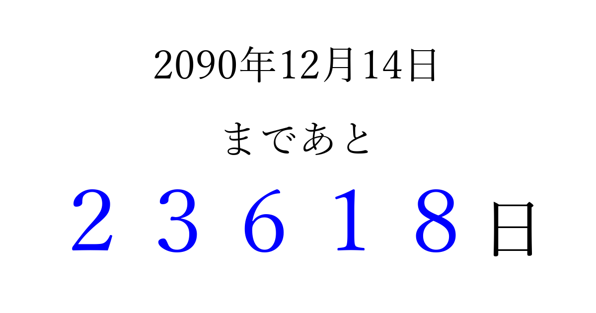 2090年12月14日(木)まで あと 99999 日です 追加すると、トップページからすぐ選べるようになります ※2026/04/16現在の結果です。 最新の状態に更新する ↓シェアして、タイムライン上にカウントダウンを表示しよう!↓ 📤 この結果を共有する Tweet シェア Threads Bluesky 別の日付でカウントダウン 2090年12月のカレンダー このページをブックマークに追加すると、いつでもカウントダウンを確認できます。 (PC: Ctrl+D / Mac: ⌘+D) hitome-notes.comでは以下のページも運営しています。 指定日と期間から日付を計算 | ガチャ確率計算・シミュレーション | プライバシー・ポリシー 運営者:Avocado