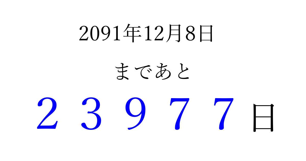 2091年12月8日(土)まで あと 99999 日です 追加すると、トップページからすぐ選べるようになります ※2026/04/16現在の結果です。 最新の状態に更新する ↓シェアして、タイムライン上にカウントダウンを表示しよう!↓ 📤 この結果を共有する Tweet シェア Threads Bluesky 別の日付でカウントダウン 2091年12月のカレンダー このページをブックマークに追加すると、いつでもカウントダウンを確認できます。 (PC: Ctrl+D / Mac: ⌘+D) hitome-notes.comでは以下のページも運営しています。 指定日と期間から日付を計算 | ガチャ確率計算・シミュレーション | プライバシー・ポリシー 運営者:Avocado