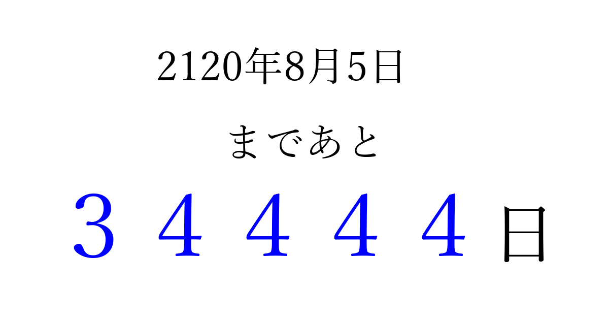 2120年8月5日(月)まで あと 99999 日です 追加すると、トップページからすぐ選べるようになります ※2026/04/16現在の結果です。 最新の状態に更新する ↓シェアして、タイムライン上にカウントダウンを表示しよう!↓ 📤 この結果を共有する Tweet シェア Threads Bluesky 別の日付でカウントダウン 2120年8月のカレンダー このページをブックマークに追加すると、いつでもカウントダウンを確認できます。 (PC: Ctrl+D / Mac: ⌘+D) hitome-notes.comでは以下のページも運営しています。 指定日と期間から日付を計算 | ガチャ確率計算・シミュレーション | プライバシー・ポリシー 運営者:Avocado