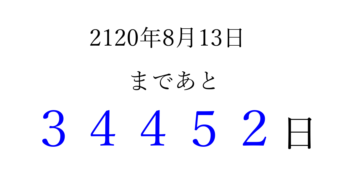2120年8月13日(火)まで あと 99999 日です 追加すると、トップページからすぐ選べるようになります ※2026/04/16現在の結果です。 最新の状態に更新する ↓シェアして、タイムライン上にカウントダウンを表示しよう!↓ 📤 この結果を共有する Tweet シェア Threads Bluesky 別の日付でカウントダウン 2120年8月のカレンダー このページをブックマークに追加すると、いつでもカウントダウンを確認できます。 (PC: Ctrl+D / Mac: ⌘+D) hitome-notes.comでは以下のページも運営しています。 指定日と期間から日付を計算 | ガチャ確率計算・シミュレーション | プライバシー・ポリシー 運営者:Avocado