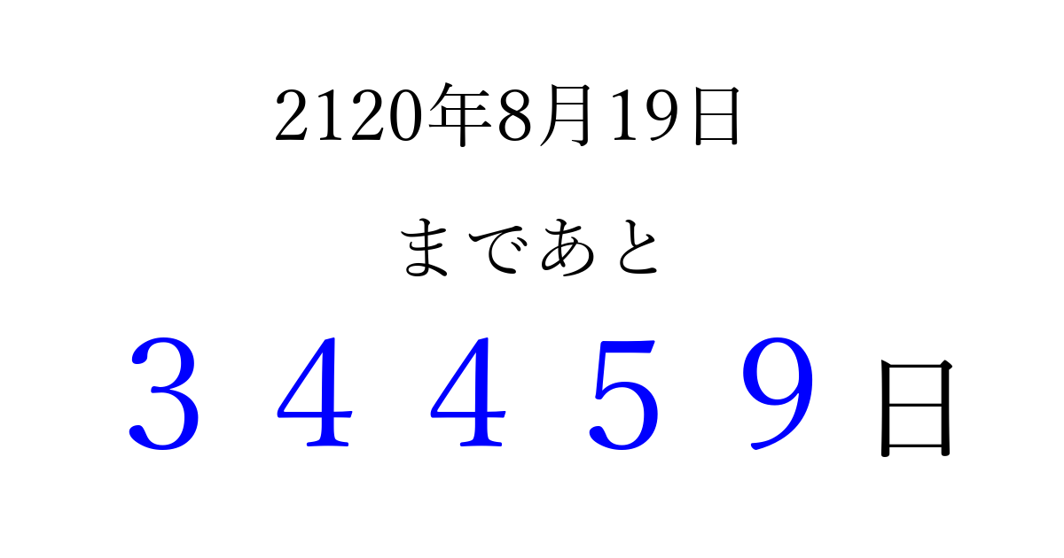 2120年8月19日(月)まで あと 99999 日です 追加すると、トップページからすぐ選べるようになります ※2026/04/15現在の結果です。 最新の状態に更新する ↓シェアして、タイムライン上にカウントダウンを表示しよう!↓ 📤 この結果を共有する Tweet シェア Threads Bluesky 別の日付でカウントダウン 2120年8月のカレンダー このページをブックマークに追加すると、いつでもカウントダウンを確認できます。 (PC: Ctrl+D / Mac: ⌘+D) hitome-notes.comでは以下のページも運営しています。 指定日と期間から日付を計算 | ガチャ確率計算・シミュレーション | プライバシー・ポリシー 運営者:Avocado