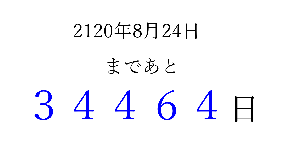 2120年8月24日(土)まで あと 99999 日です 追加すると、トップページからすぐ選べるようになります ※2026/04/15現在の結果です。 最新の状態に更新する ↓シェアして、タイムライン上にカウントダウンを表示しよう!↓ 📤 この結果を共有する Tweet シェア Threads Bluesky 別の日付でカウントダウン 2120年8月のカレンダー このページをブックマークに追加すると、いつでもカウントダウンを確認できます。 (PC: Ctrl+D / Mac: ⌘+D) hitome-notes.comでは以下のページも運営しています。 指定日と期間から日付を計算 | ガチャ確率計算・シミュレーション | プライバシー・ポリシー 運営者:Avocado
