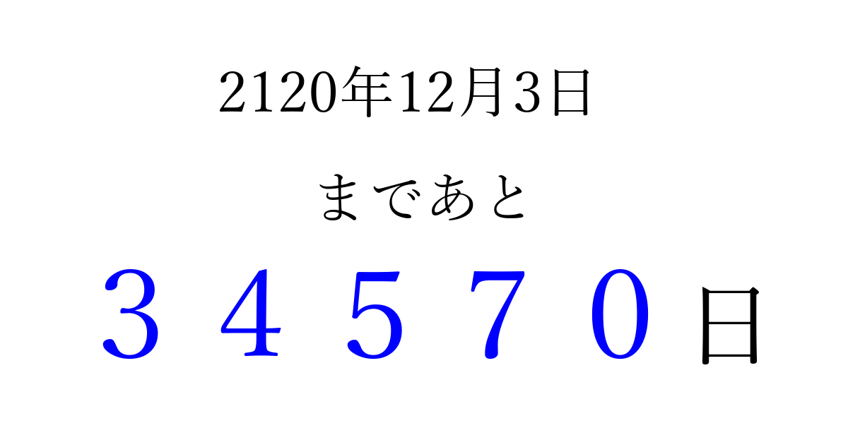 2120年12月3日(火)まで あと 99999 日です 追加すると、トップページからすぐ選べるようになります ※2026/04/10現在の結果です。 最新の状態に更新する ↓シェアして、タイムライン上にカウントダウンを表示しよう!↓ 📤 この結果を共有する Tweet シェア Threads Bluesky 別の日付でカウントダウン 2120年12月のカレンダー このページをブックマークに追加すると、いつでもカウントダウンを確認できます。 (PC: Ctrl+D / Mac: ⌘+D) hitome-notes.comでは以下のページも運営しています。 指定日と期間から日付を計算 | ガチャ確率計算・シミュレーション | プライバシー・ポリシー 運営者:Avocado