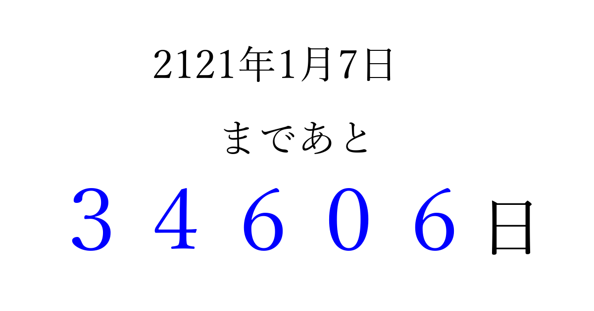 2121年1月7日(火)まで あと 99999 日です 追加すると、トップページからすぐ選べるようになります ※2026/04/09現在の結果です。 最新の状態に更新する ↓シェアして、タイムライン上にカウントダウンを表示しよう!↓ 📤 この結果を共有する Tweet シェア Threads Bluesky 別の日付でカウントダウン 2121年1月のカレンダー このページをブックマークに追加すると、いつでもカウントダウンを確認できます。 (PC: Ctrl+D / Mac: ⌘+D) hitome-notes.comでは以下のページも運営しています。 指定日と期間から日付を計算 | ガチャ確率計算・シミュレーション | プライバシー・ポリシー 運営者:Avocado