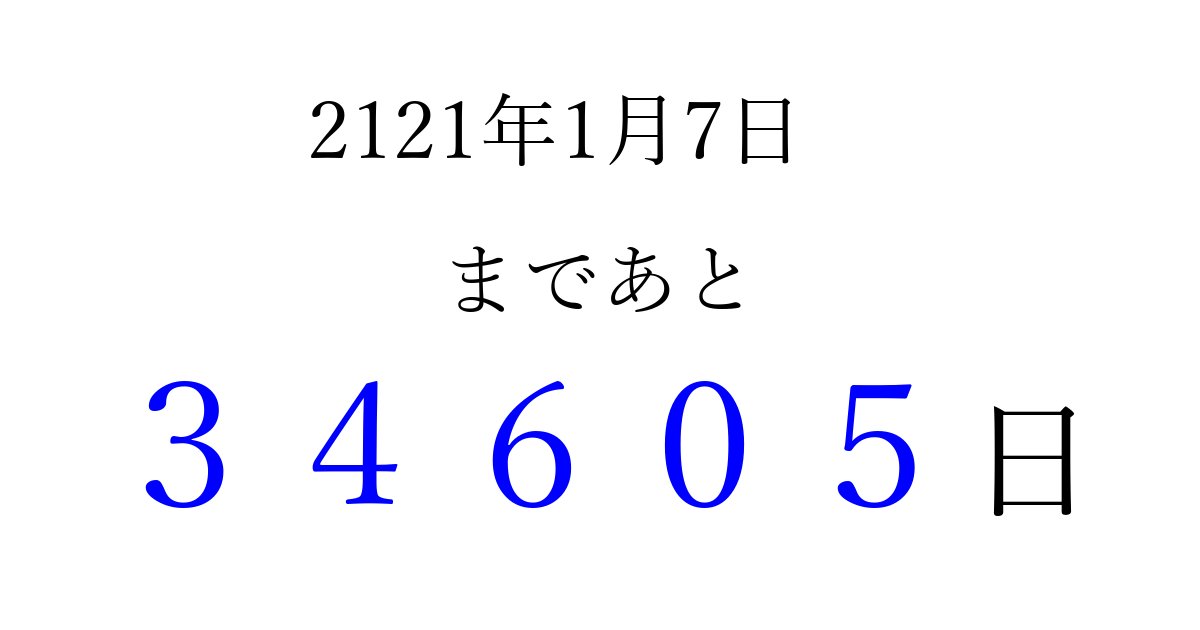 2121年1月7日(火)まで あと 99999 日です 追加すると、トップページからすぐ選べるようになります ※2026/04/10現在の結果です。 最新の状態に更新する ↓シェアして、タイムライン上にカウントダウンを表示しよう!↓ 📤 この結果を共有する Tweet シェア Threads Bluesky 別の日付でカウントダウン 2121年1月のカレンダー このページをブックマークに追加すると、いつでもカウントダウンを確認できます。 (PC: Ctrl+D / Mac: ⌘+D) hitome-notes.comでは以下のページも運営しています。 指定日と期間から日付を計算 | ガチャ確率計算・シミュレーション | プライバシー・ポリシー 運営者:Avocado