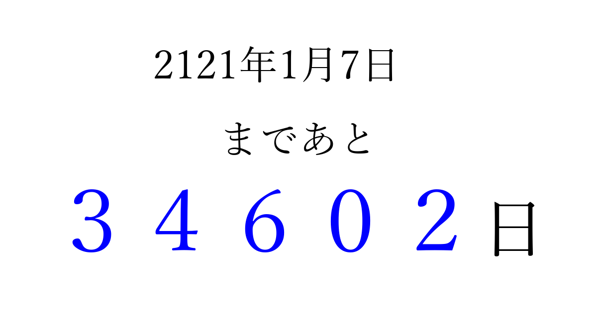 2121年1月7日(火)まで あと 99999 日です 追加すると、トップページからすぐ選べるようになります ※2026/04/13現在の結果です。 最新の状態に更新する ↓シェアして、タイムライン上にカウントダウンを表示しよう!↓ 📤 この結果を共有する Tweet シェア Threads Bluesky 別の日付でカウントダウン 2121年1月のカレンダー このページをブックマークに追加すると、いつでもカウントダウンを確認できます。 (PC: Ctrl+D / Mac: ⌘+D) hitome-notes.comでは以下のページも運営しています。 指定日と期間から日付を計算 | ガチャ確率計算・シミュレーション | プライバシー・ポリシー 運営者:Avocado