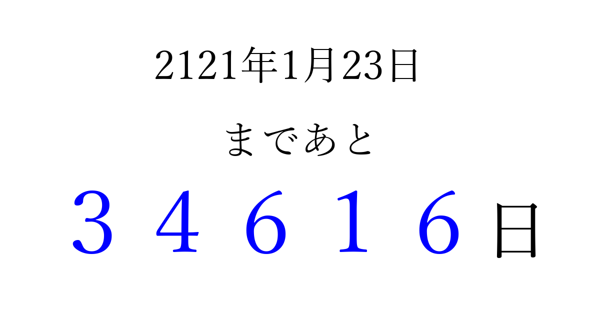 2121年1月23日(木)まで あと 99999 日です 追加すると、トップページからすぐ選べるようになります ※2026/04/15現在の結果です。 最新の状態に更新する ↓シェアして、タイムライン上にカウントダウンを表示しよう!↓ 📤 この結果を共有する Tweet シェア Threads Bluesky 別の日付でカウントダウン 2121年1月のカレンダー このページをブックマークに追加すると、いつでもカウントダウンを確認できます。 (PC: Ctrl+D / Mac: ⌘+D) hitome-notes.comでは以下のページも運営しています。 指定日と期間から日付を計算 | ガチャ確率計算・シミュレーション | プライバシー・ポリシー 運営者:Avocado