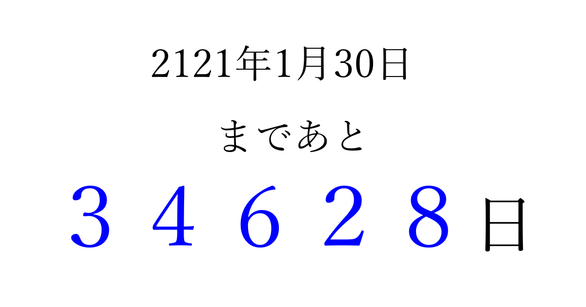 2121年1月30日(木)まで あと 99999 日です 追加すると、トップページからすぐ選べるようになります ※2026/04/10現在の結果です。 最新の状態に更新する ↓シェアして、タイムライン上にカウントダウンを表示しよう!↓ 📤 この結果を共有する Tweet シェア Threads Bluesky 別の日付でカウントダウン 2121年1月のカレンダー このページをブックマークに追加すると、いつでもカウントダウンを確認できます。 (PC: Ctrl+D / Mac: ⌘+D) hitome-notes.comでは以下のページも運営しています。 指定日と期間から日付を計算 | ガチャ確率計算・シミュレーション | プライバシー・ポリシー 運営者:Avocado