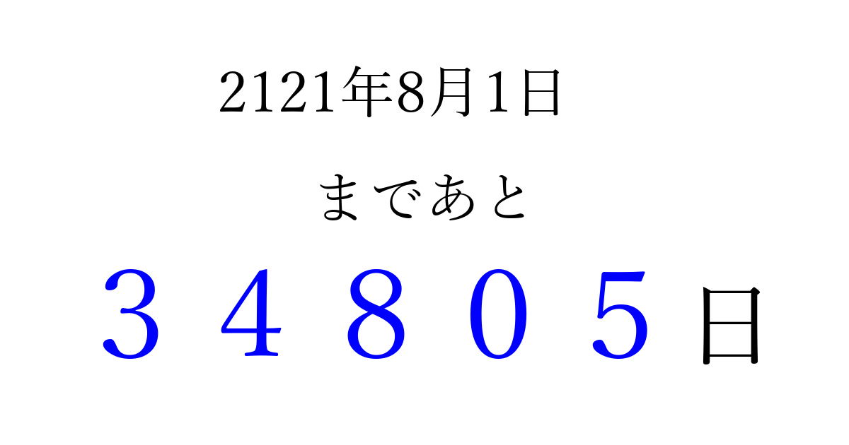 2121年8月1日(金)まで あと 99999 日です 追加すると、トップページからすぐ選べるようになります ※2026/04/16現在の結果です。 最新の状態に更新する ↓シェアして、タイムライン上にカウントダウンを表示しよう!↓ 📤 この結果を共有する Tweet シェア Threads Bluesky 別の日付でカウントダウン 2121年8月のカレンダー このページをブックマークに追加すると、いつでもカウントダウンを確認できます。 (PC: Ctrl+D / Mac: ⌘+D) hitome-notes.comでは以下のページも運営しています。 指定日と期間から日付を計算 | ガチャ確率計算・シミュレーション | プライバシー・ポリシー 運営者:Avocado