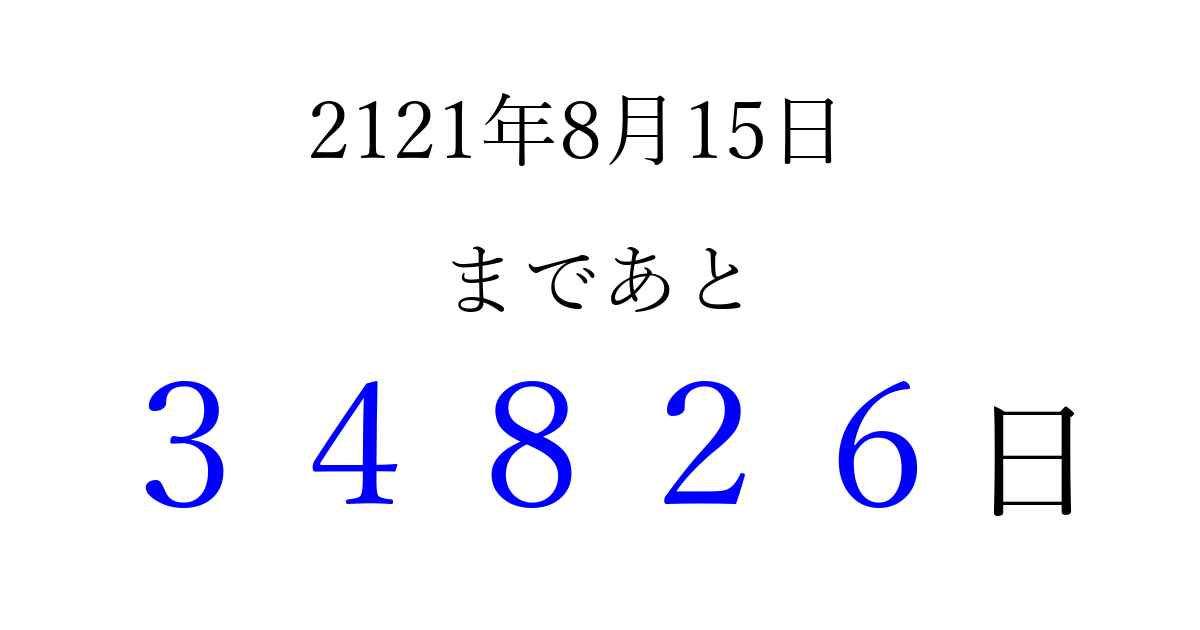 2121年8月15日(金)まで あと 99999 日です 追加すると、トップページからすぐ選べるようになります ※2026/04/09現在の結果です。 最新の状態に更新する ↓シェアして、タイムライン上にカウントダウンを表示しよう!↓ 📤 この結果を共有する Tweet シェア Threads Bluesky 別の日付でカウントダウン 2121年8月のカレンダー このページをブックマークに追加すると、いつでもカウントダウンを確認できます。 (PC: Ctrl+D / Mac: ⌘+D) hitome-notes.comでは以下のページも運営しています。 指定日と期間から日付を計算 | ガチャ確率計算・シミュレーション | プライバシー・ポリシー 運営者:Avocado