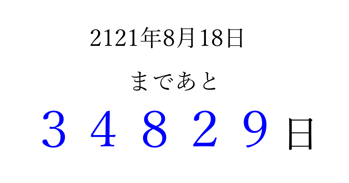 2121年8月18日(月)まで あと 99999 日です 追加すると、トップページからすぐ選べるようになります ※2026/04/09現在の結果です。 最新の状態に更新する ↓シェアして、タイムライン上にカウントダウンを表示しよう!↓ 📤 この結果を共有する Tweet シェア Threads Bluesky 別の日付でカウントダウン 2121年8月のカレンダー このページをブックマークに追加すると、いつでもカウントダウンを確認できます。 (PC: Ctrl+D / Mac: ⌘+D) hitome-notes.comでは以下のページも運営しています。 指定日と期間から日付を計算 | ガチャ確率計算・シミュレーション | プライバシー・ポリシー 運営者:Avocado