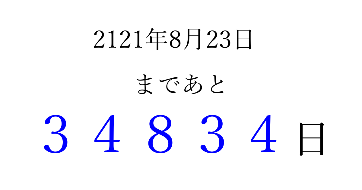 2121年8月23日(土)まで あと 99999 日です 追加すると、トップページからすぐ選べるようになります ※2026/04/09現在の結果です。 最新の状態に更新する ↓シェアして、タイムライン上にカウントダウンを表示しよう!↓ 📤 この結果を共有する Tweet シェア Threads Bluesky 別の日付でカウントダウン 2121年8月のカレンダー このページをブックマークに追加すると、いつでもカウントダウンを確認できます。 (PC: Ctrl+D / Mac: ⌘+D) hitome-notes.comでは以下のページも運営しています。 指定日と期間から日付を計算 | ガチャ確率計算・シミュレーション | プライバシー・ポリシー 運営者:Avocado