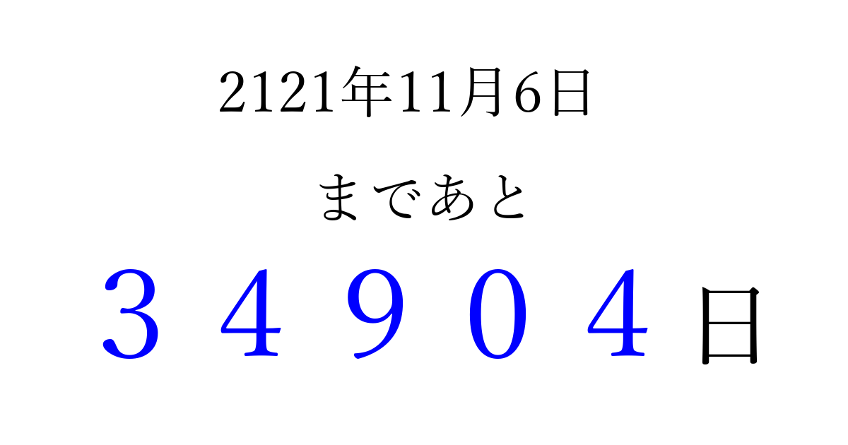 2121年11月6日(木)まで あと 99999 日です 追加すると、トップページからすぐ選べるようになります ※2026/04/14現在の結果です。 最新の状態に更新する ↓シェアして、タイムライン上にカウントダウンを表示しよう!↓ 📤 この結果を共有する Tweet シェア Threads Bluesky 別の日付でカウントダウン 2121年11月のカレンダー このページをブックマークに追加すると、いつでもカウントダウンを確認できます。 (PC: Ctrl+D / Mac: ⌘+D) hitome-notes.comでは以下のページも運営しています。 指定日と期間から日付を計算 | ガチャ確率計算・シミュレーション | プライバシー・ポリシー 運営者:Avocado