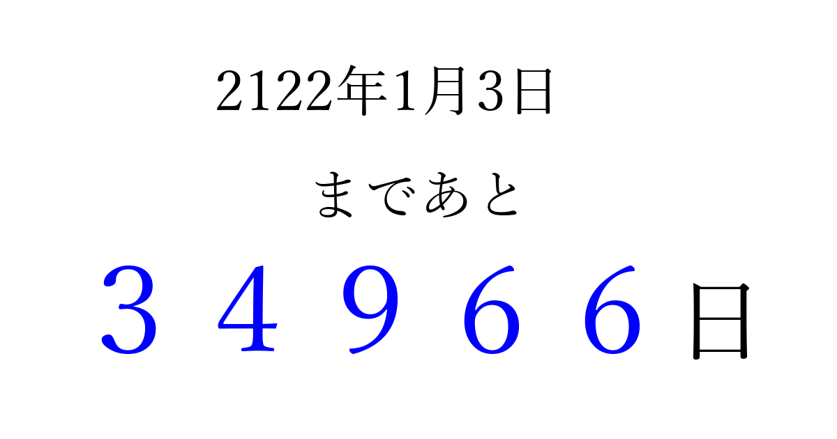 2122年1月3日(土)まで あと 99999 日です 追加すると、トップページからすぐ選べるようになります ※2026/04/10現在の結果です。 最新の状態に更新する ↓シェアして、タイムライン上にカウントダウンを表示しよう!↓ 📤 この結果を共有する Tweet シェア Threads Bluesky 別の日付でカウントダウン 2122年1月のカレンダー このページをブックマークに追加すると、いつでもカウントダウンを確認できます。 (PC: Ctrl+D / Mac: ⌘+D) hitome-notes.comでは以下のページも運営しています。 指定日と期間から日付を計算 | ガチャ確率計算・シミュレーション | プライバシー・ポリシー 運営者:Avocado