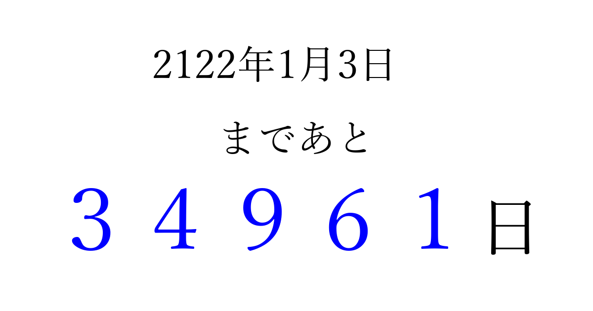 2122年1月3日(土)まで あと 99999 日です 追加すると、トップページからすぐ選べるようになります ※2026/04/15現在の結果です。 最新の状態に更新する ↓シェアして、タイムライン上にカウントダウンを表示しよう!↓ 📤 この結果を共有する Tweet シェア Threads Bluesky 別の日付でカウントダウン 2122年1月のカレンダー このページをブックマークに追加すると、いつでもカウントダウンを確認できます。 (PC: Ctrl+D / Mac: ⌘+D) hitome-notes.comでは以下のページも運営しています。 指定日と期間から日付を計算 | ガチャ確率計算・シミュレーション | プライバシー・ポリシー 運営者:Avocado