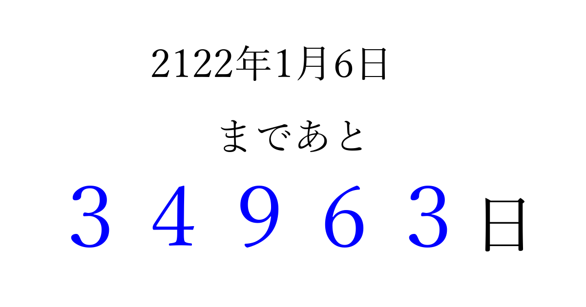 2122年1月6日(火)まで あと 99999 日です 追加すると、トップページからすぐ選べるようになります ※2026/04/16現在の結果です。 最新の状態に更新する ↓シェアして、タイムライン上にカウントダウンを表示しよう!↓ 📤 この結果を共有する Tweet シェア Threads Bluesky 別の日付でカウントダウン 2122年1月のカレンダー このページをブックマークに追加すると、いつでもカウントダウンを確認できます。 (PC: Ctrl+D / Mac: ⌘+D) hitome-notes.comでは以下のページも運営しています。 指定日と期間から日付を計算 | ガチャ確率計算・シミュレーション | プライバシー・ポリシー 運営者:Avocado