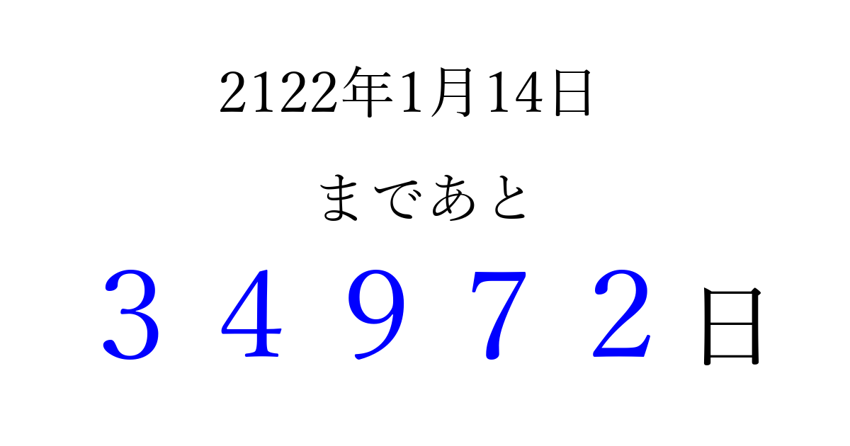2122年1月14日(水)まで あと 99999 日です 追加すると、トップページからすぐ選べるようになります ※2026/04/15現在の結果です。 最新の状態に更新する ↓シェアして、タイムライン上にカウントダウンを表示しよう!↓ 📤 この結果を共有する Tweet シェア Threads Bluesky 別の日付でカウントダウン 2122年1月のカレンダー このページをブックマークに追加すると、いつでもカウントダウンを確認できます。 (PC: Ctrl+D / Mac: ⌘+D) hitome-notes.comでは以下のページも運営しています。 指定日と期間から日付を計算 | ガチャ確率計算・シミュレーション | プライバシー・ポリシー 運営者:Avocado