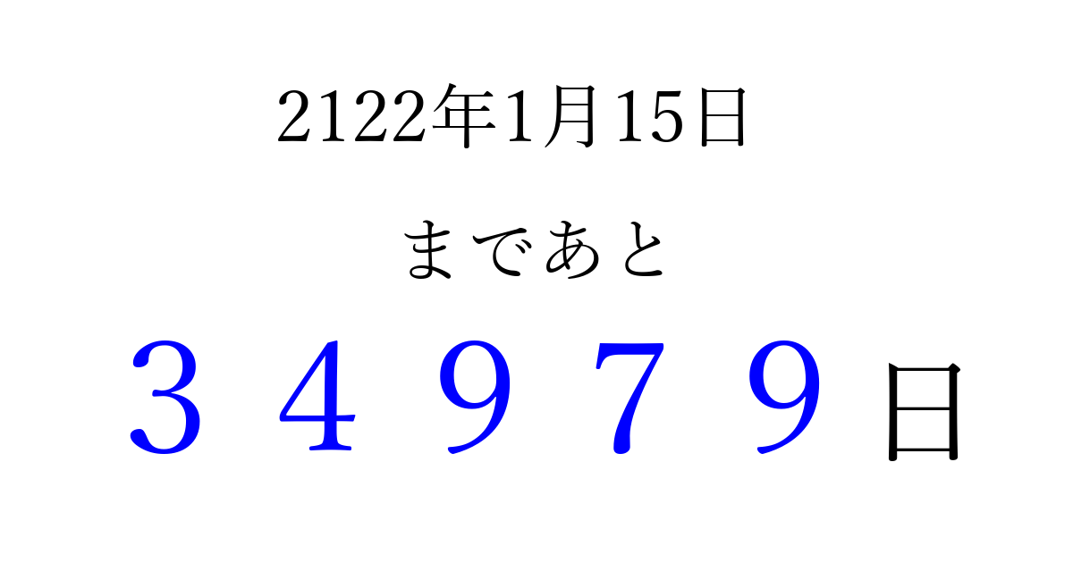 2122年1月15日(木)まで あと 99999 日です 追加すると、トップページからすぐ選べるようになります ※2026/04/09現在の結果です。 最新の状態に更新する ↓シェアして、タイムライン上にカウントダウンを表示しよう!↓ 📤 この結果を共有する Tweet シェア Threads Bluesky 別の日付でカウントダウン 2122年1月のカレンダー このページをブックマークに追加すると、いつでもカウントダウンを確認できます。 (PC: Ctrl+D / Mac: ⌘+D) hitome-notes.comでは以下のページも運営しています。 指定日と期間から日付を計算 | ガチャ確率計算・シミュレーション | プライバシー・ポリシー 運営者:Avocado