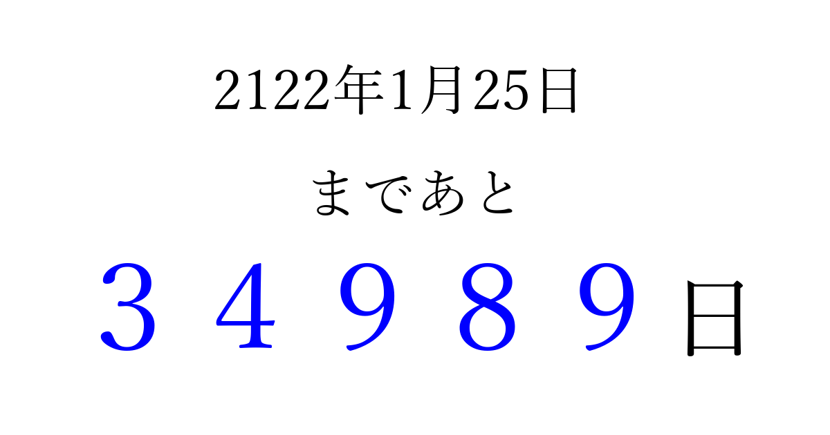 2122年1月25日(日)まで あと 99999 日です 追加すると、トップページからすぐ選べるようになります ※2026/04/09現在の結果です。 最新の状態に更新する ↓シェアして、タイムライン上にカウントダウンを表示しよう!↓ 📤 この結果を共有する Tweet シェア Threads Bluesky 別の日付でカウントダウン 2122年1月のカレンダー このページをブックマークに追加すると、いつでもカウントダウンを確認できます。 (PC: Ctrl+D / Mac: ⌘+D) hitome-notes.comでは以下のページも運営しています。 指定日と期間から日付を計算 | ガチャ確率計算・シミュレーション | プライバシー・ポリシー 運営者:Avocado