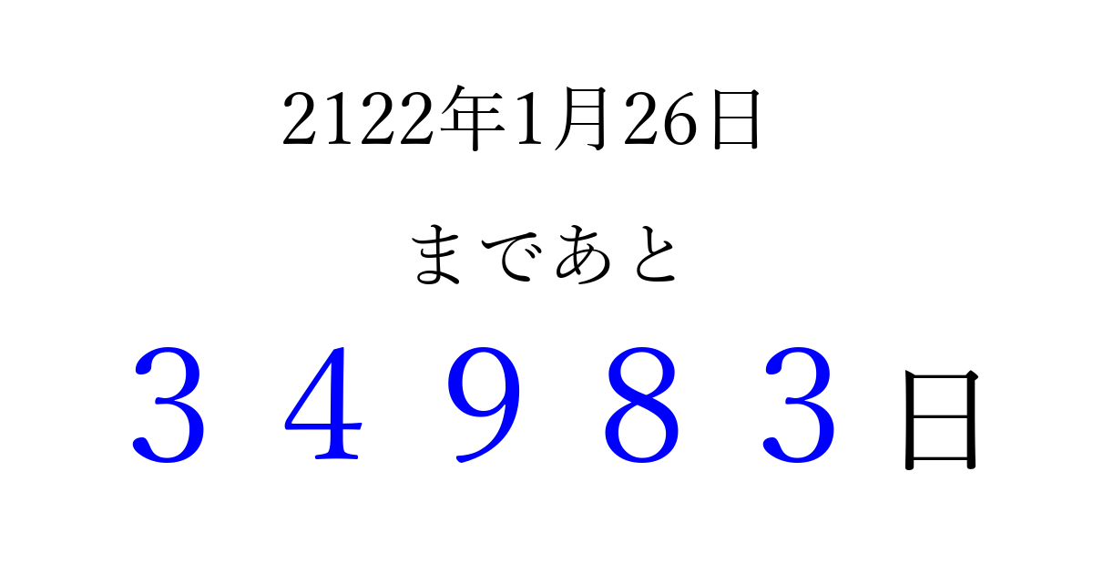 2122年1月26日(月)まで あと 99999 日です 追加すると、トップページからすぐ選べるようになります ※2026/04/16現在の結果です。 最新の状態に更新する ↓シェアして、タイムライン上にカウントダウンを表示しよう!↓ 📤 この結果を共有する Tweet シェア Threads Bluesky 別の日付でカウントダウン 2122年1月のカレンダー このページをブックマークに追加すると、いつでもカウントダウンを確認できます。 (PC: Ctrl+D / Mac: ⌘+D) hitome-notes.comでは以下のページも運営しています。 指定日と期間から日付を計算 | ガチャ確率計算・シミュレーション | プライバシー・ポリシー 運営者:Avocado